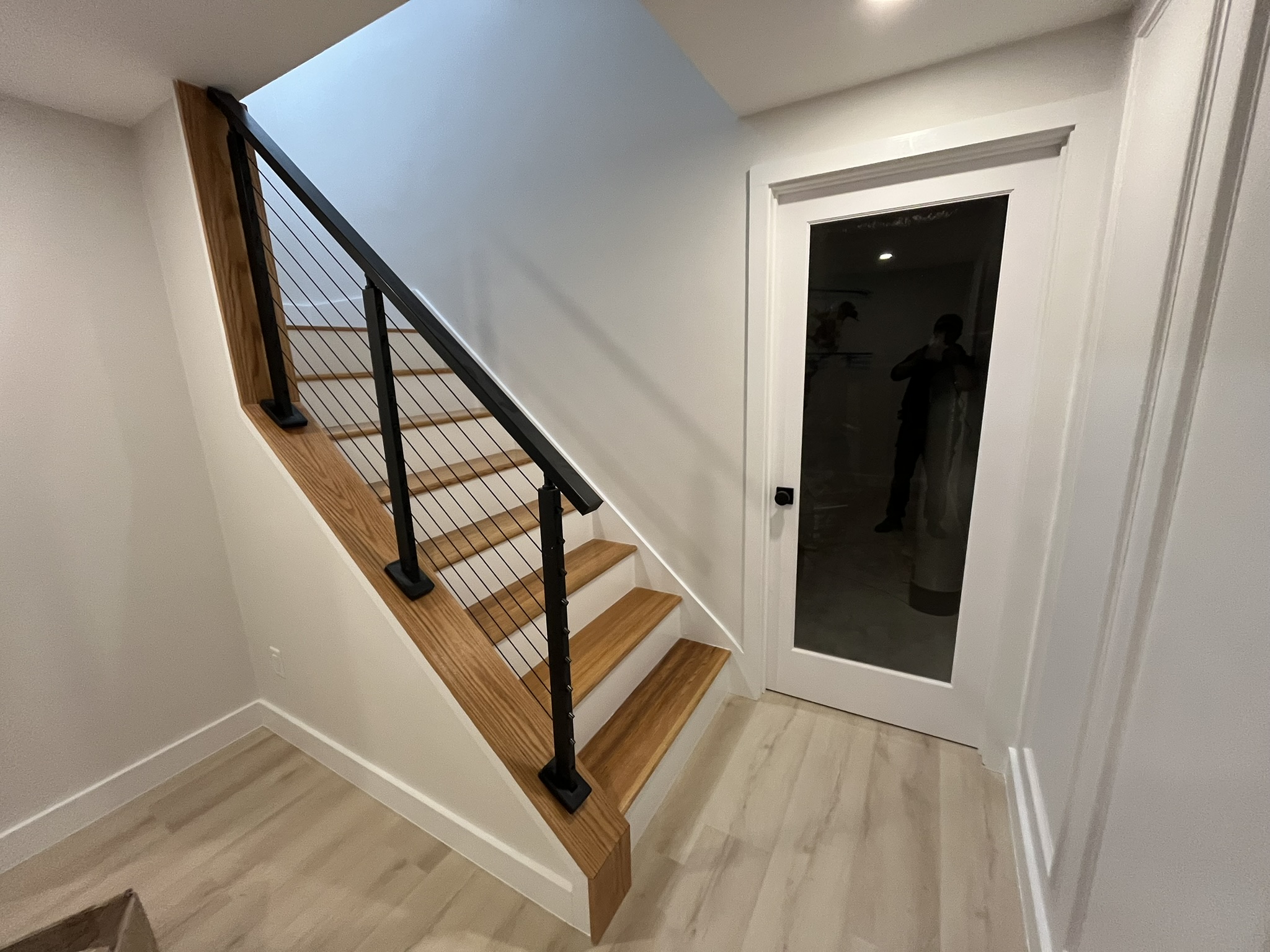 • Open Stairway Design: Removed one side wall for an open concept and installed a new railing with painted wood treads.