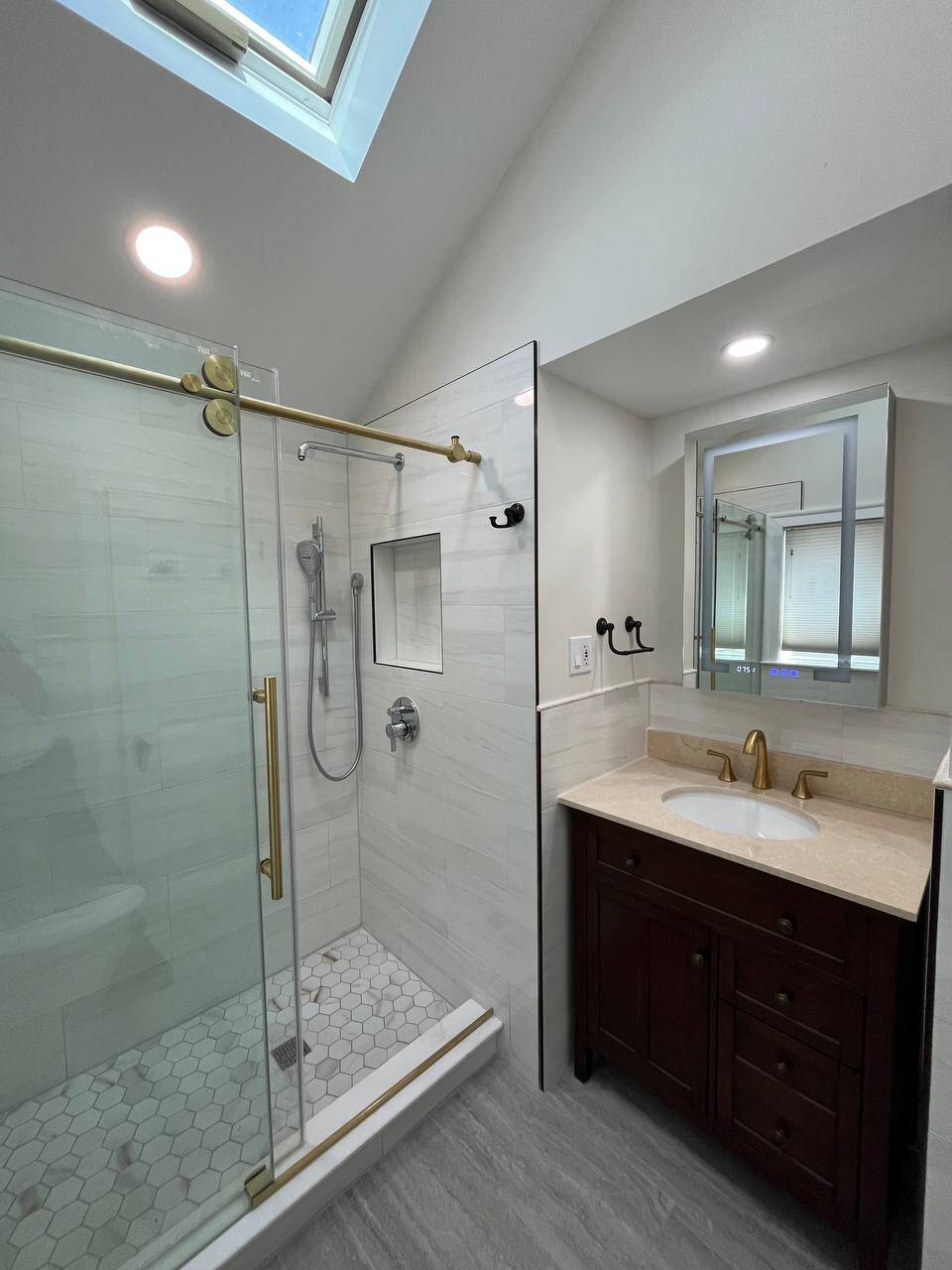 Sun Shore Construction proudly presents the “Luxe Transformation at Bedford St,” a testament to our expertise in bathroom remodeling. This project involved transforming a dated bathroom into a modern sanctuary, seamlessly blending functionality and luxury. From the sleek walk-in shower to the updated bathroom hardware, every detail was designed with care to meet our client’s needs and aesthetic preferences.