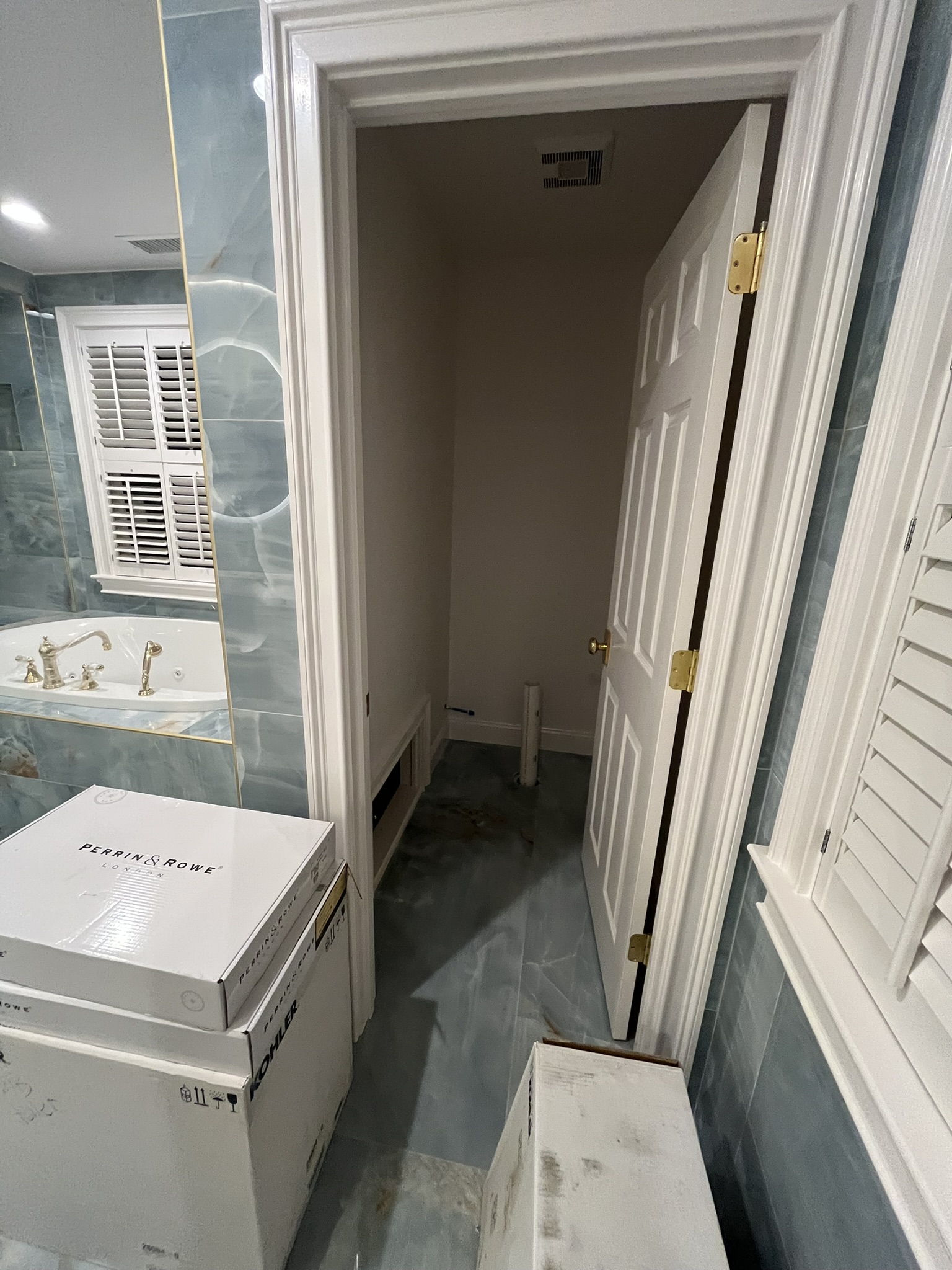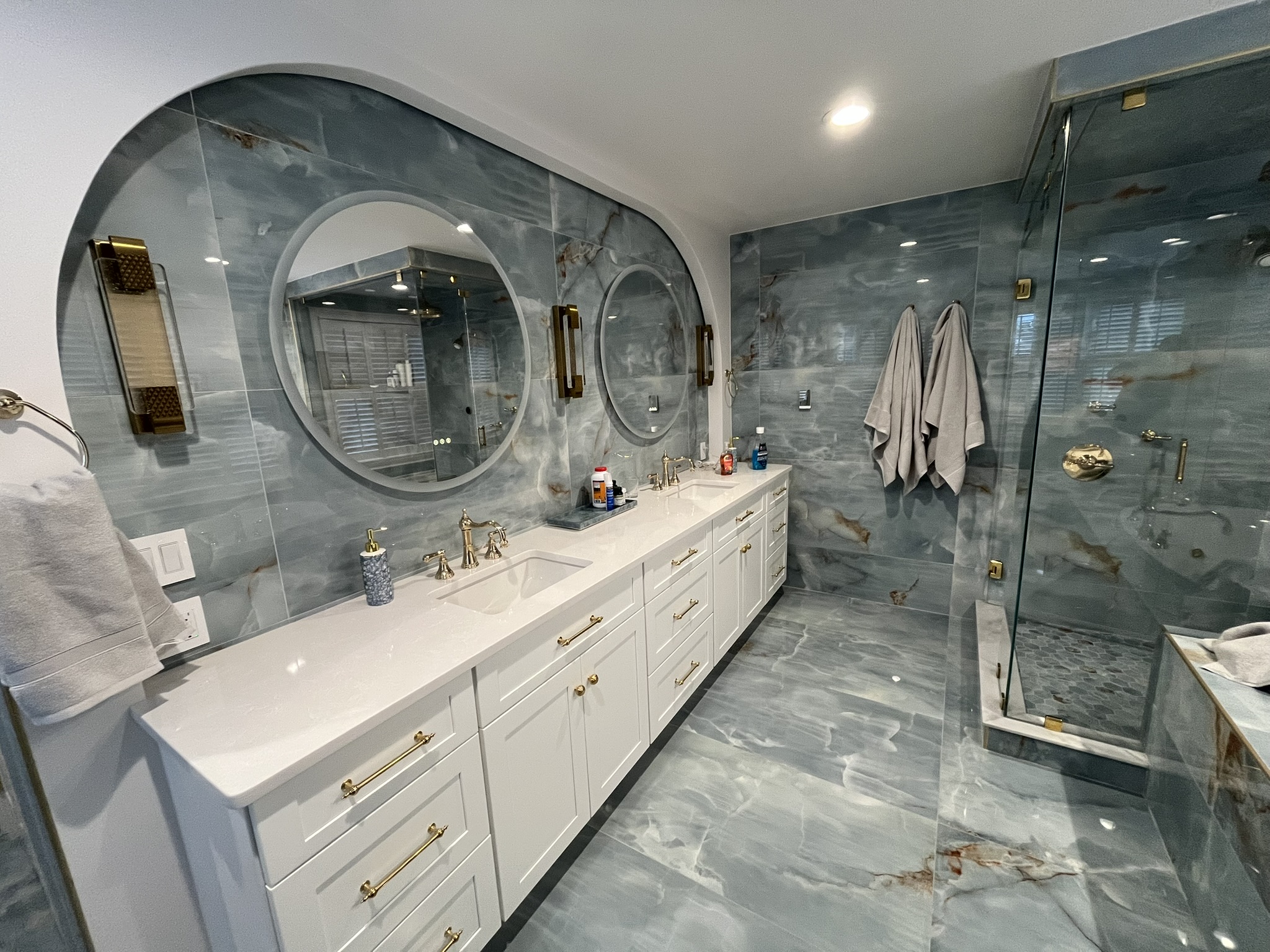 This remodel included a complete redesign of the space with polished porcelain tile throughout, a custom walk-in shower with frameless glass, and a new jacuzzi tub installation. We also installed a custom double vanity with quartz countertops, accent lighting, and high-end fixtures in a stunning gold finish.