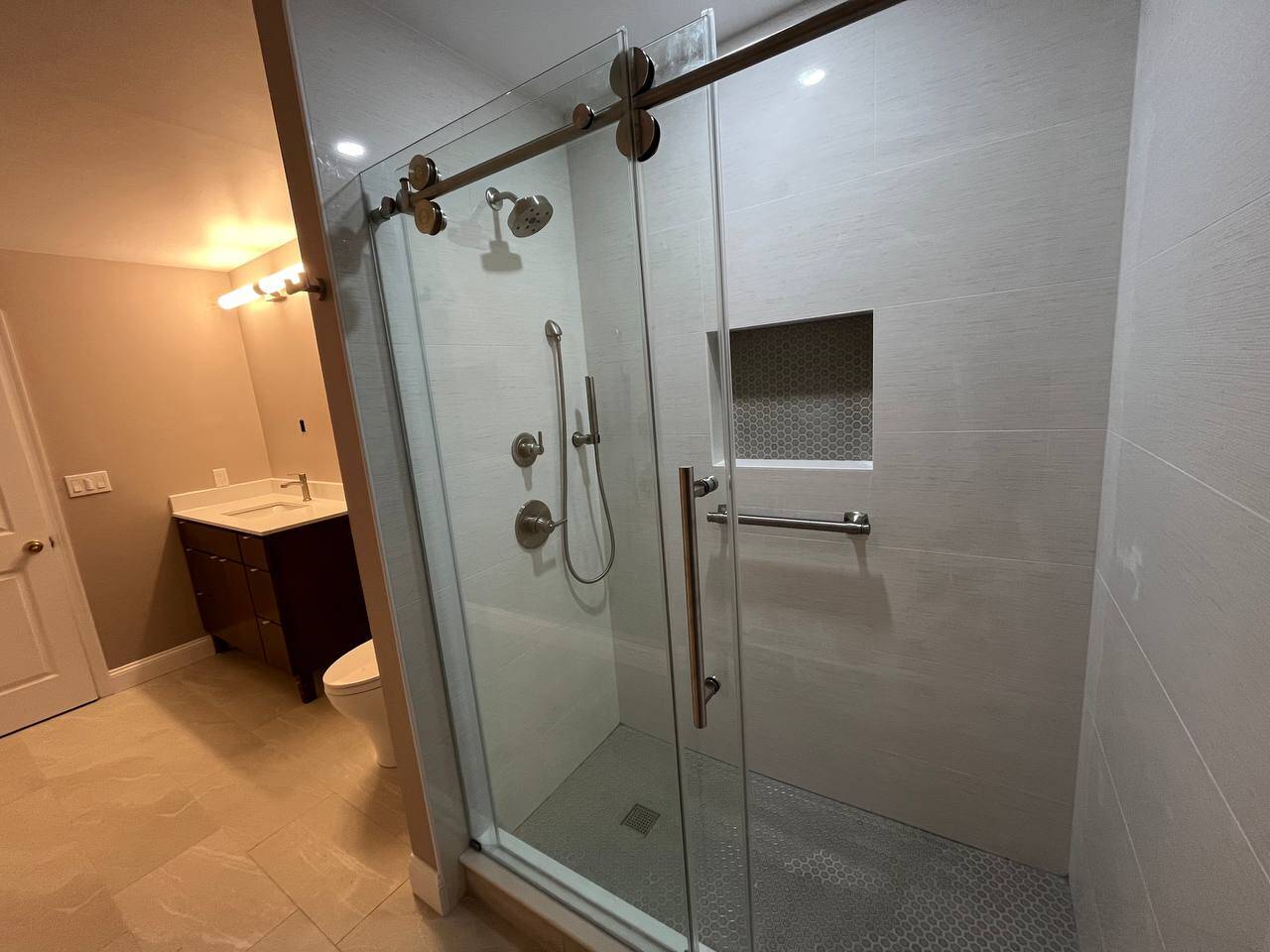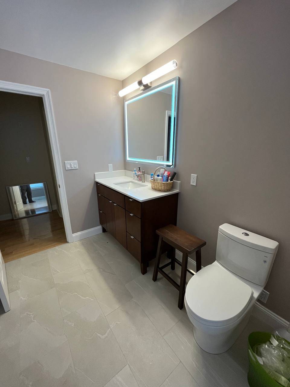 • Vanity Installation: Installed a stylish vanity with modern faucets and a sleek mirror.
