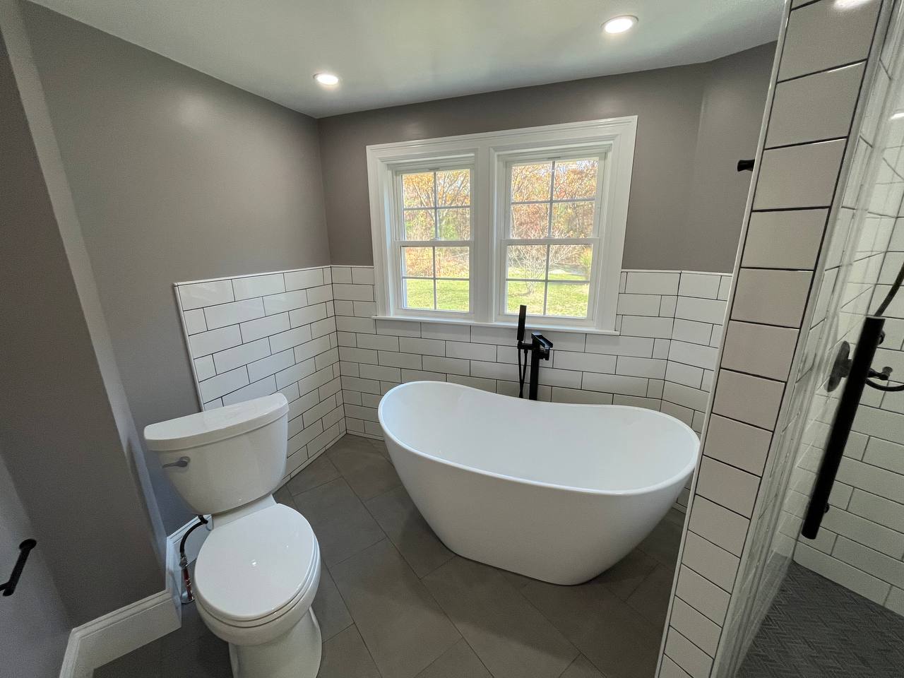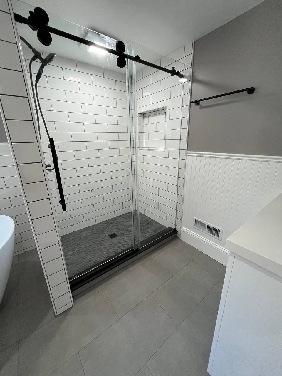 The project highlights include a custom walk-in shower with a sleek glass enclosure, luxurious subway tiles, a freestanding bathtub, and upgraded bathroom lighting. Each element was chosen to create a timeless design while enhancing the overall functionality of the bathrooms.